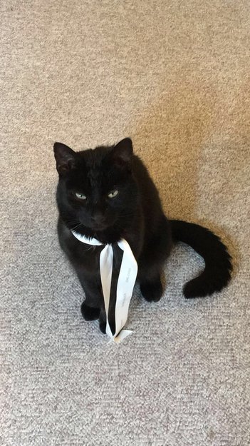 Svart, slank, liten hvit flekk på brystet. Har en litt dysfunksjonell klo på ene fremre pote som han ikke kan trekke inn.