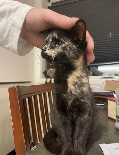 She is a small cat, and slim! She is less than one year old! She is black and orange, has a large orange patch on the back of her head, and the back of one ear! She has green eyes