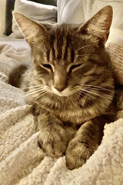 Grå-spraglet kastrert hannkatt er på vift. Han har vært borte siden natt til mandag (26.06.22). Han er nervøs for andre katter og kan ha vandret langt for å gjemme seg.