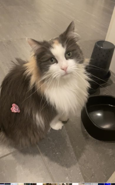 !!!!! DUSØR 3000kr !!!!! Hun er grå, hvit og brun. Mest brun ved nakken, og litt ved rompe parti. Har på seg flått bånd. Er chippet. Kan være litt skvetten og redd for andre. Er en stor skogskatt på ca 5 kg.