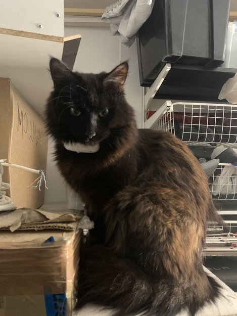 Svart / mokka farget. Langhåret. Pratsom. Hadde halsbånd på da hun ble borte.