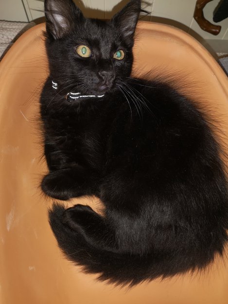 Svart kattunge født 1 april kom seg ut i går kveld😔. Har ikke vært ute før.