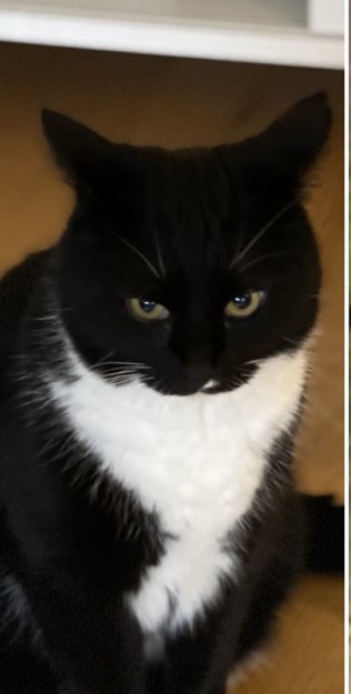 Det er en stor hannkatt sort med hvitt under halsen og hvite poter. Snill men kan virke litt nervøs. Chippet.