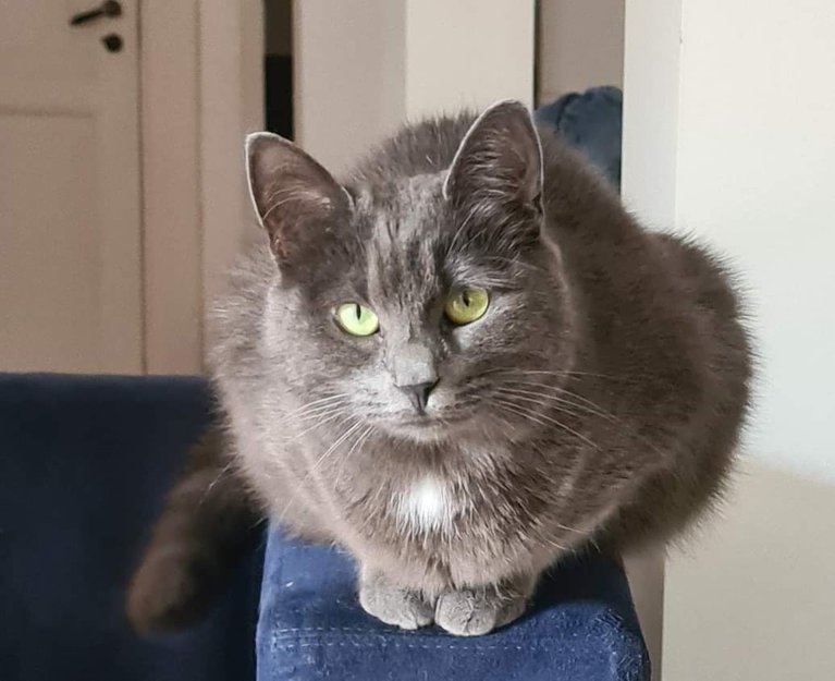 Grå hunkatt med liten hvit flekk på bryst. Har tatovering i øre. Litt skeptisk fra mennesker og ganske redd fra mye lyd, men veldig snill.
