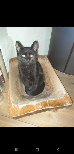 8 mnd gammel men er en stor katt. Noen få hvite hår i brøstet. Veldig sosial. Vant til andre katter og hunder.