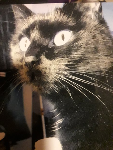 Liten 2 kg. kullsort jente med pigmentflekk på høyre øye.