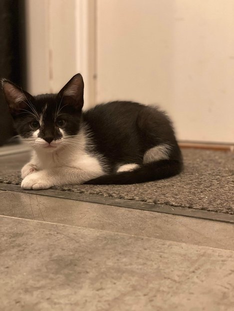 Han er ikke stor i vekst. Nesen er tydelig svart og har hvit bart. Alle potene er hvite. Han er stort sett hvit fra halsen og ned magen.