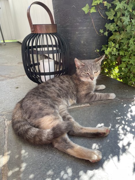 Slank ungkatt har holdt til hos oss i noen dager. Kjælen og tillitsfull. Vil gjerne inn.