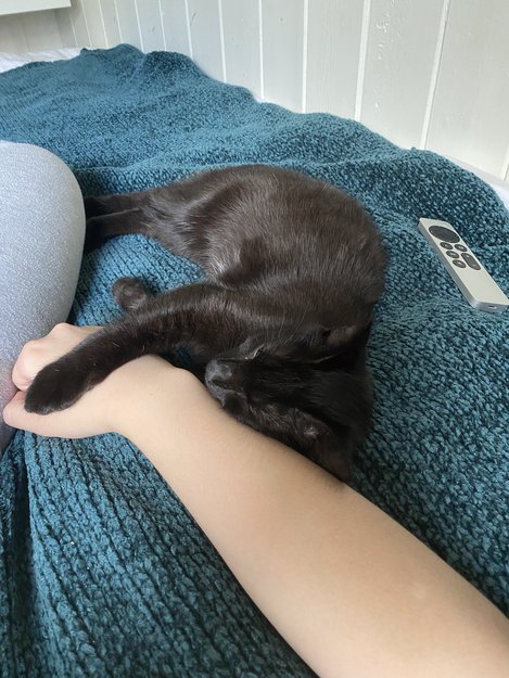 Svart hunnkatt med grønne øyne. Hun har også noen hvite hår på hele kroppen og en hvit flekk på magen. Hun er kun 6 måneder og dermed ganske liten.