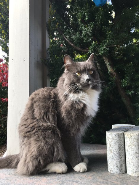 Torvald er langhåret, hovedsakelig grå med hvitt bryst og hvite sokker. Han har en hvit flekk til venstre under nesen.