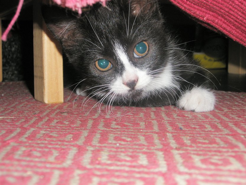Hovedsakelig svart, men noen hvite flekker på snuten og potene. En veldig tillitsfull og menneskekjær katt. Maks et par måneder gammel. Renslig.