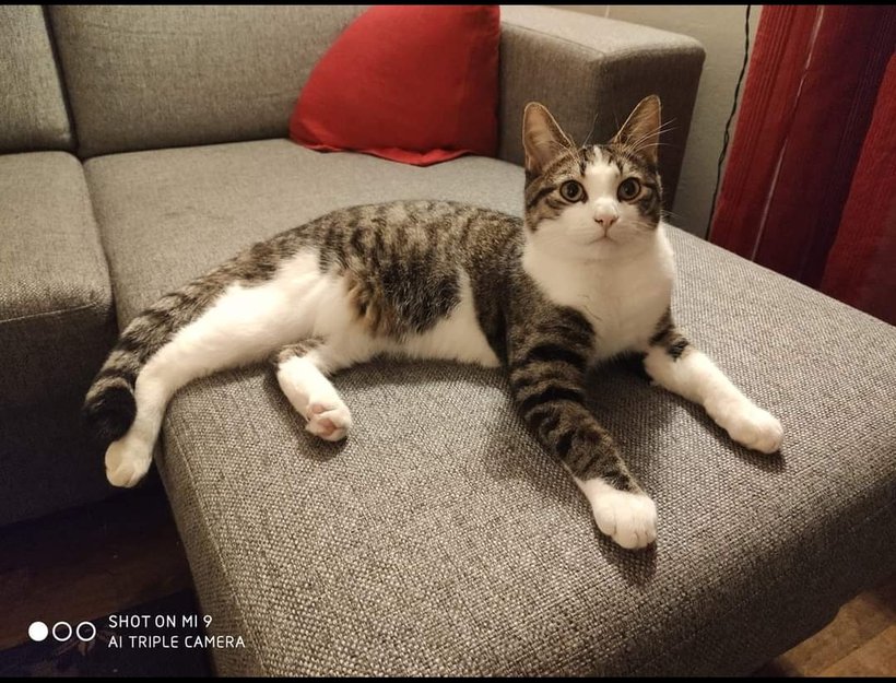 Flekken er en 3 års gammel kastrert hannkatt. Stripete og to flekker på bakbena derav navnet flekken
