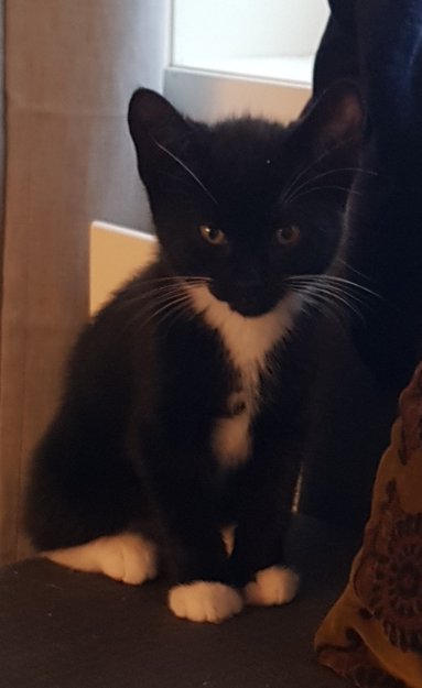 Liten kattunge med svart pels og hvite markeringer. Spisst ansikt.