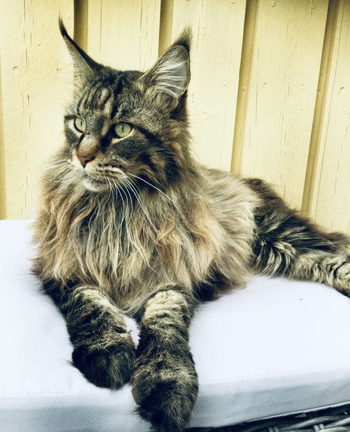 Rasen Maine Coon, ca 10 kg, hannkatt, kastrert. Rolig og pratsom. Har antydning til hoftedysplasi og halter litt når han går. Lyder navnet Cæsar. Lang pels og hårtufser på ørene. Gulgrønne øyne.
