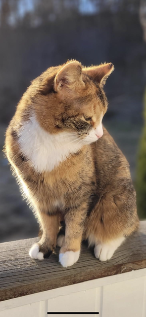 Hun er orange/lys brun, hvite poter og bryst, litt striper av svart. Som på bildet!