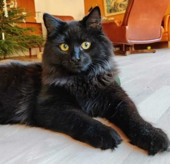 Han har helt sort lang pels og gule øyne.