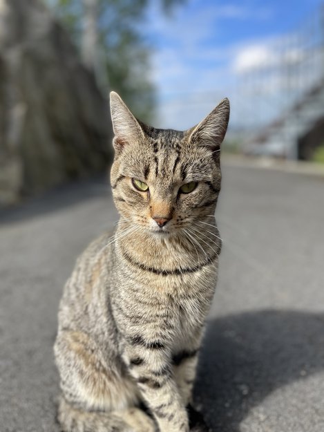 Ikke så stor, gule øyne, stripet grå og svart hale