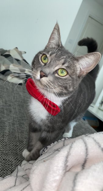 Hun er stripete grå, og hvit på potene og mage/brystkasse område. Er også litt hvit rundt snute område