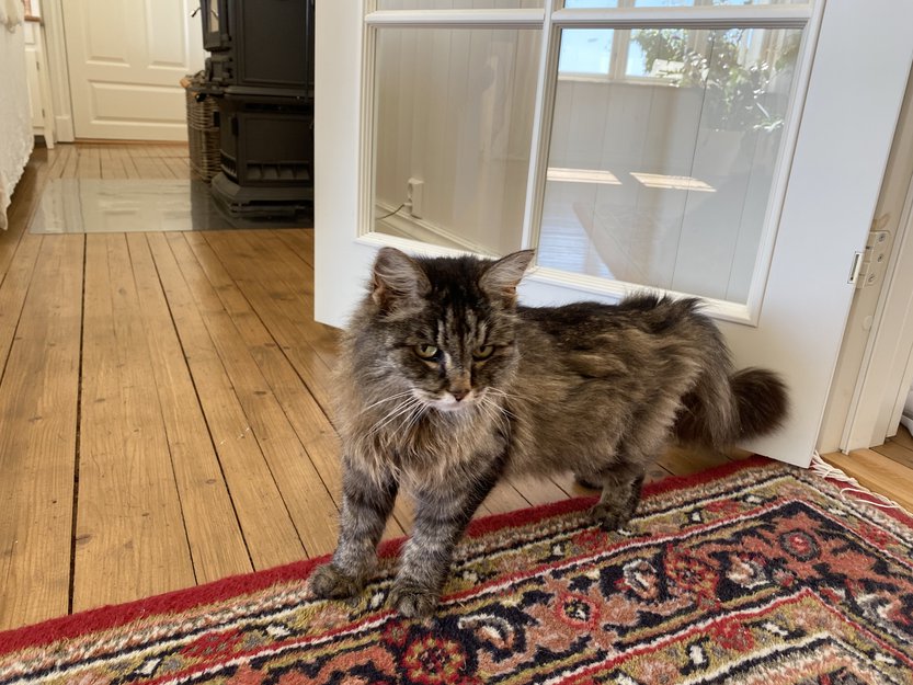 Denne pusefrøkna kom på besøk til oss i dag. Har sett henne her i nabolaget en ukes tid ,men hun søkte kontakt i dag. Tillitsfull lita frøken, men tror hun har tullet seg bort eller noe sånt, da hun er veldig underærnert.