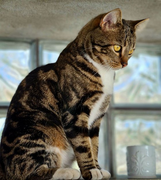 Brune og svarte striper, hvit på magen/brystet og potene, halvlang pels. Han er 4 år, chippet (ID-merket øre) og kastrert.