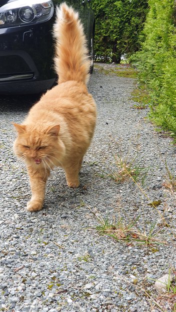 Rødhåret hannkatt mjauer og sover utover hekk i hagen våres. Han er litt redd fra oss, men kommer etterhvert til å spise. Ser ut som eldre katt. Veldig fluffy med lang sjuk pels. Vi vet ikke om den er chipert.