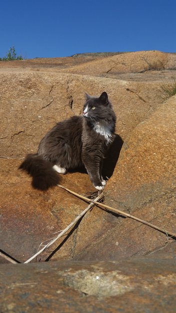 Stor hannkatt på ca 6 kg, mørk grå i fargen, med hvit stripe over nesa, hvit på brystet, magen og potene. Chippet og har M tatovert i øret