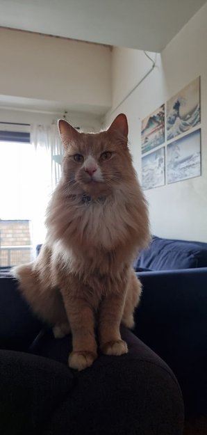 Han er en veldig snill katt, men er litt sky og blir veldig fort skremt av bråk og hunder.