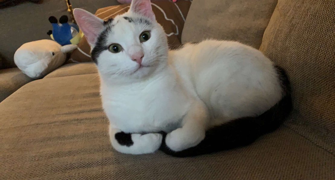 Hvit men svart hale og svart flekk på høyre pote. Sort flekk på ryggen og litt rundt ørene. Rosa ører