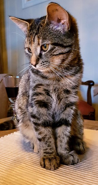 Skilpaddemønstret pels, korthåret. Er ikke spesielt folkesky. Vanligvis ganske tynn om sommeren. Har tatovering i øret og er chippet.