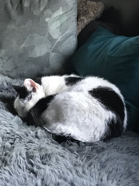 Diesel har to forskjellige farger på øynene. Svart hale og noen svarte flekker. Han er veldig kosete, ihvertfall med de han kjenner.Skulle gjerne lagt til flere bilder men, det fikk jeg ikke til. Dette bilder får med de svarte flekkene han har. Han er mest hvit i pelsen.