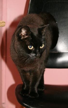 Ganske liten, ca 3 - 5 år, tynn, tatovert i begge ørene med tre tall, såret etter sterilisering kjennes godt. Snill og rolig, tam og kosete. Prater litt.