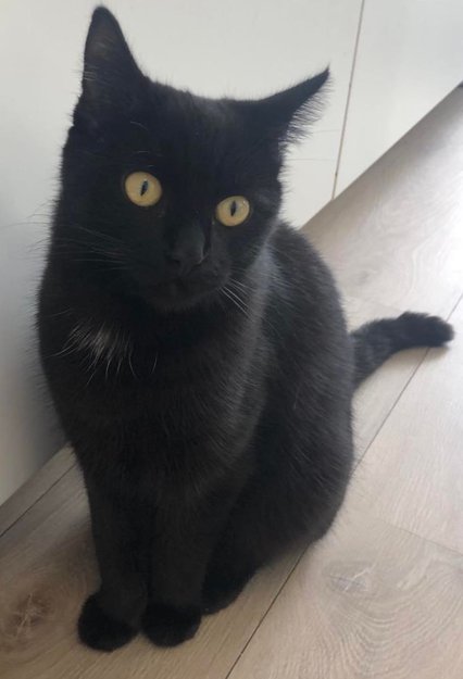 Hannkatten Miss er svart og er litt hvit under haken, men dette er ikke veldig synlig. Vanligvis veldig kosete og tillitsfull. Miss er 1 år gammel.