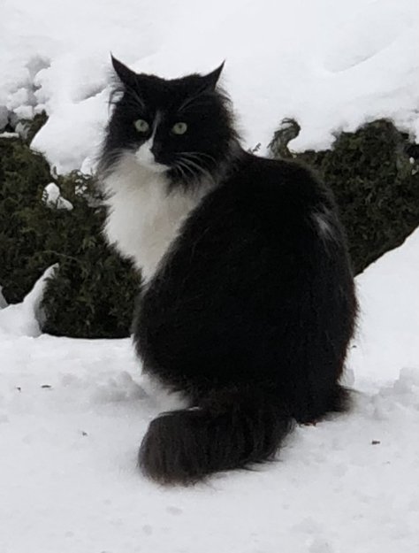 Hvit og svart langhåret. Halve nesen er hvit og den andre delen er svart.