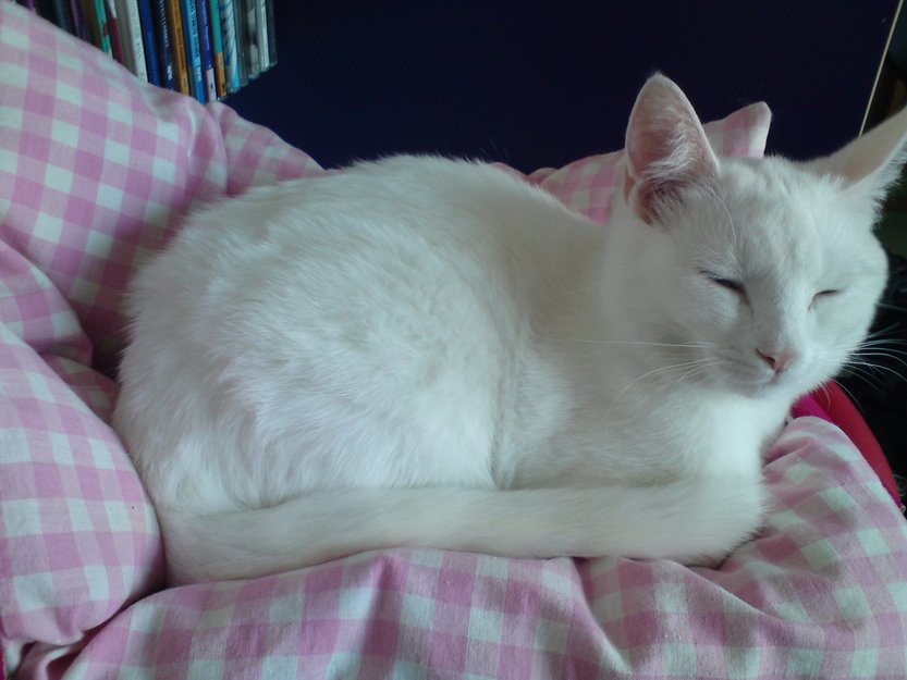 Helt blå øyne, ganske slank. Helt hvit. Ganske redd for fremmede.