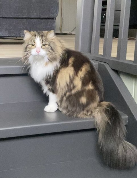 Hvit på hals og bryst, samt hvite poter. Mørkere på rygg og hale. Veldig fluffy og langhåret katt. Sky mot fremmede. Vant til å være ute, men ikke kjent i nærområdet.