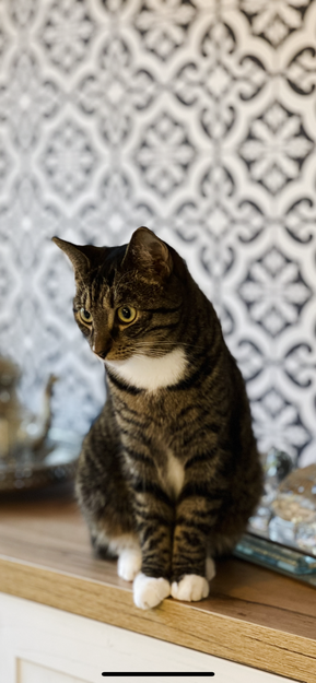 Brungrå svarte tigersteiper. Hvite bakbein, den ene er mer hvit enn andre. Hvite poter med brune flekker under. Hvit flekk under haken. Tatovert i øret. Den er også chippet. Blir 2 år i august.
