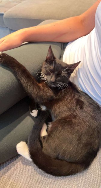 Hun er ca 7 måneder gammel, nesten helt svart, med hvite poter, hvit på halsen og under magen. Hun er glad i mennesker og kommer som regel når man puser på henne.