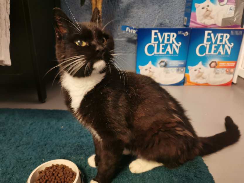 Utsultet katt, sannsynligvis hunkatt, med tover i pelsen og kutt i ører. Vandret rundt Storhaugen/Gjerdhaugen, veldig kontaktsøkende. Meldt på dyregrupper på Facebook, men ikke funnet eier. Tatt den med inn for at den skal få mat, vann og varme.