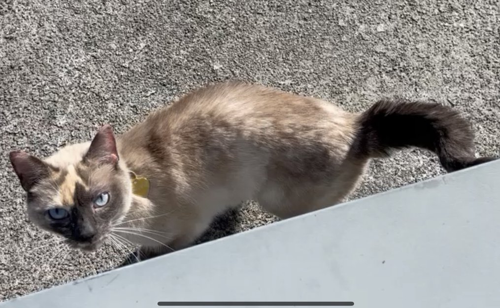 Hun har grå og hvit farge, lyse blå øyne. Hun har halsbånd med hennes navn og telefon nummer på.
