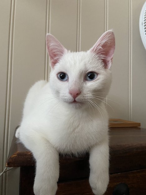 Helt hvit, lett rosa/solbrente ører når det er finvær og mor ikke har smurt på solkrem.