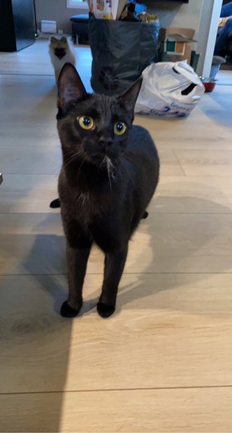 Hun er svart med noen få hvite hår på brystet og gule øyne. Hun er heller ikke så stor, vil si at hun er mindre enn de fleste katter. I sollys kan det se ut som hun har et lite brunskjær i pelsen. Hun er en innekatt og har ikke vært ute før og er nervøs på nye plasser. Hun er ganske forsiktig i nye omgivelser, men svarer gjerne på pusing. Hun vil neppe komme fram av seg selv og vil måtte hentes ut fra der hun evt. gjemmer seg. Hun er glad i mat og kommer alltid når hun hører matskålen, hvertfall gjør hun det inne.