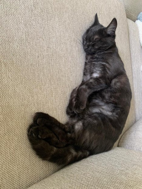 Hun er svart, brå og hvit med tigerstripet hale og poter. Har også noen hvit hår på ører og på mage. Hun er veldig snill og mjauer mye.