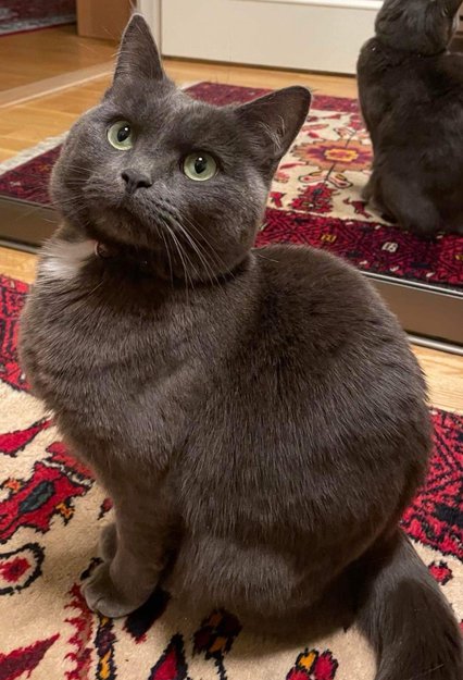 Grå med hvit flekk på brystet. Grønne øyne. Rosa halsbånd. Veldig nysgjerrig på andre dyr og mennesker.