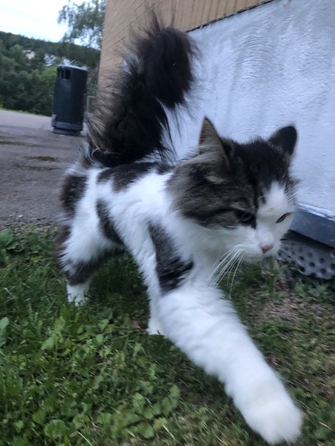 Funnet natt. Veldig tynn, men trygg på mennesker og veldig kjælen. Virker forlatt. Etterlyst eier på savner side på Facebook.