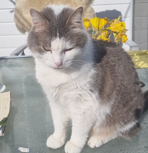Grønne øyne, hvit og grå eldre katt, som har vært innekatt før den flyttet til meg. Har derfor gradvis vent seg til utelivet og aldri vandret langt før. Er redd den har kommet for langt vekk og ikke finner hjem.