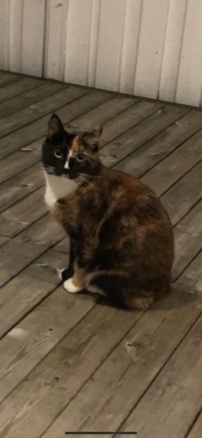 Hun er 4 år, sort/brun/hvit i pelsen (se bilde), forholdsvis liten av vekst, er utrolig glad i kos og er ikke redd mennesker. Hun er chippet og sterilisert. Har et lite hakk i et øret. Holder til i Bjørgelien i Fyllingsdalen.