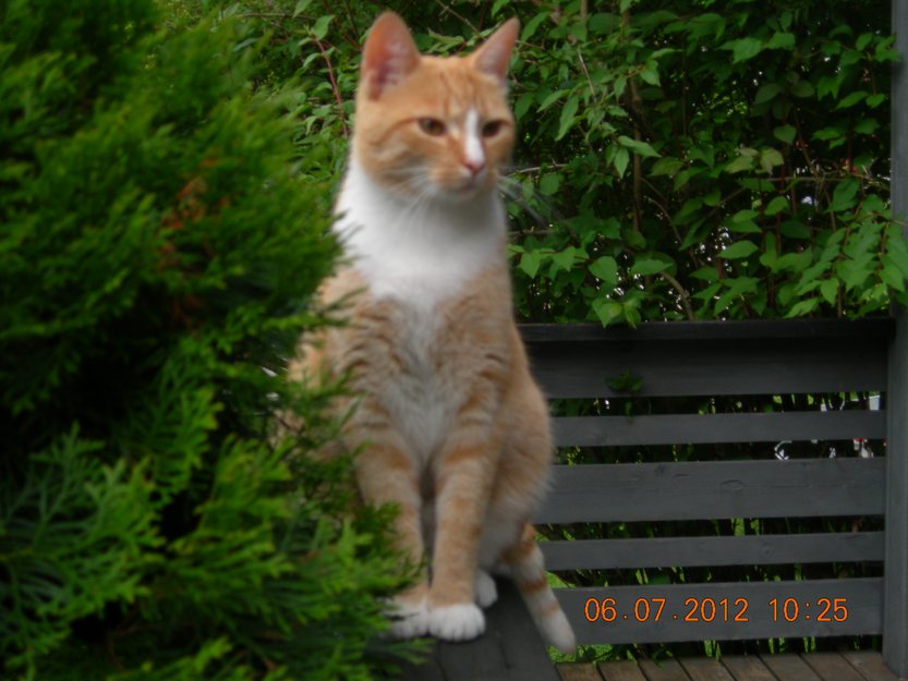 Kastrert. Rød med hvitt bryst, hvite poter og hvite striper på halen. "Prater". Glad i kos.