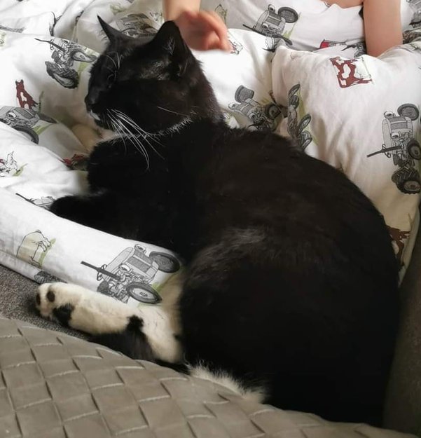 Han er en stor og langbent hankatt, sort og hvit, og med en karakteristisk hvit bart.