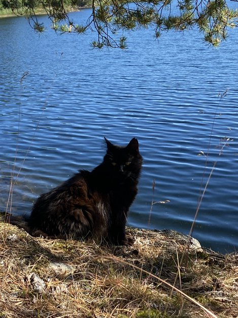 Liten, voksen hunnkatt. Litt brunstenk i den svarte pelsen. Glad i kos, men er litt sky og ser an folk.