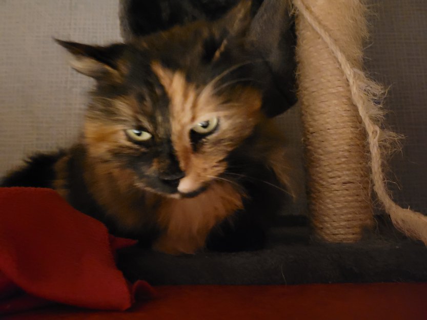 Katten er barbert, men pelsen er begynt å vokse ut igjen, kan se litt rar ut da pelsen har vokst litt ujevnt. Har hvit haletupp